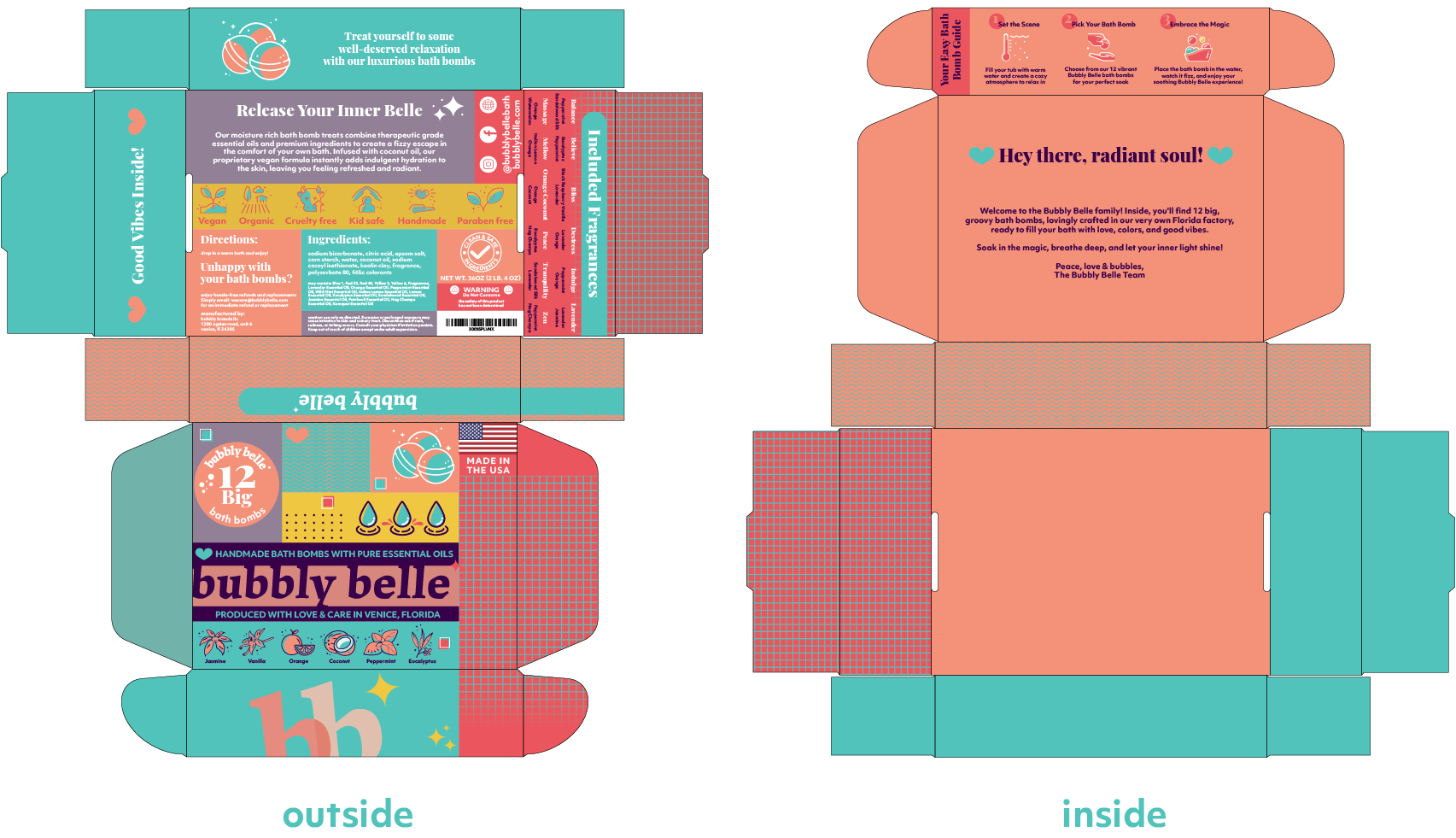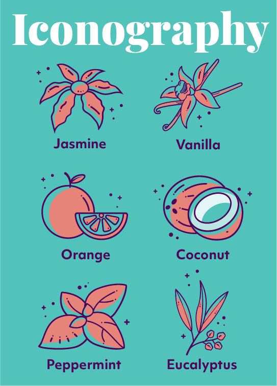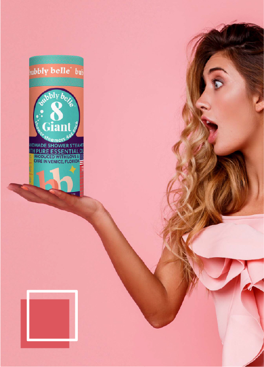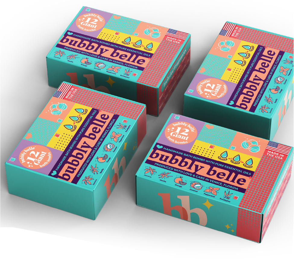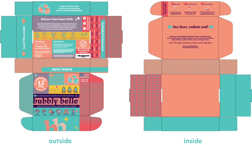 I opted not to alter the logo itself, recognizing its strong association with Bubbly Belle’s existing community of loyal customers. By preserving this visual anchor, we maintained continuity in the market while embarking on a refreshing brand transformation. In aligning with Bubbly Belle’s vision for a modern, colorful, and playful brand, I carefully curated a palette that exudes both vibrancy and tranquility. I introduced a harmonious blend of tones, including “Soothing Seafoam” turquoise, “Lavender Mist” light purple, “Peachy Paradise” peach, “Crimson Bliss” carmine red, and “Sunshine Spark” yellow. Each color resonates with the brand’s aspiration for a modern, colorful, and playful identity, enhancing the joy and relaxation associated with their products. Employing an “Organized Chaos” approach in layout design, I struck a balance between order and spontaneity. This layout not only provides a structured framework for communication but also mirrors the fluidity of relaxation, inviting customers to find solace in the gentle chaos, offering a therapeutic escape from daily stresses. In summary, these strategic choices were made to preserve brand recognition, evoke playfulness, and offer a calming yet joyful experience for customers, aligning closely with Bubbly Belle’s mission of bringing more calm into the world through indulgent self-care experiences.