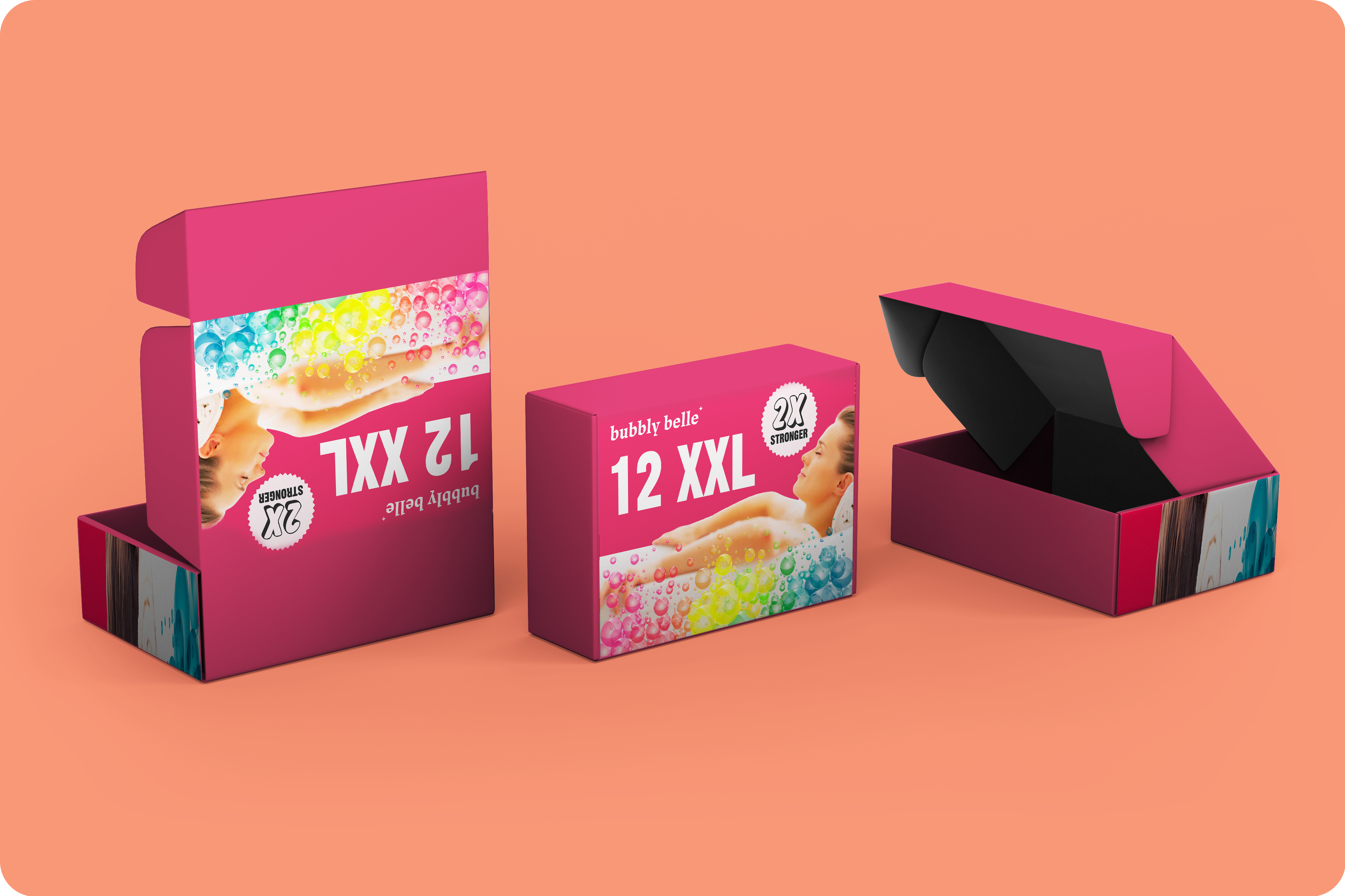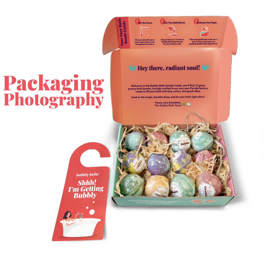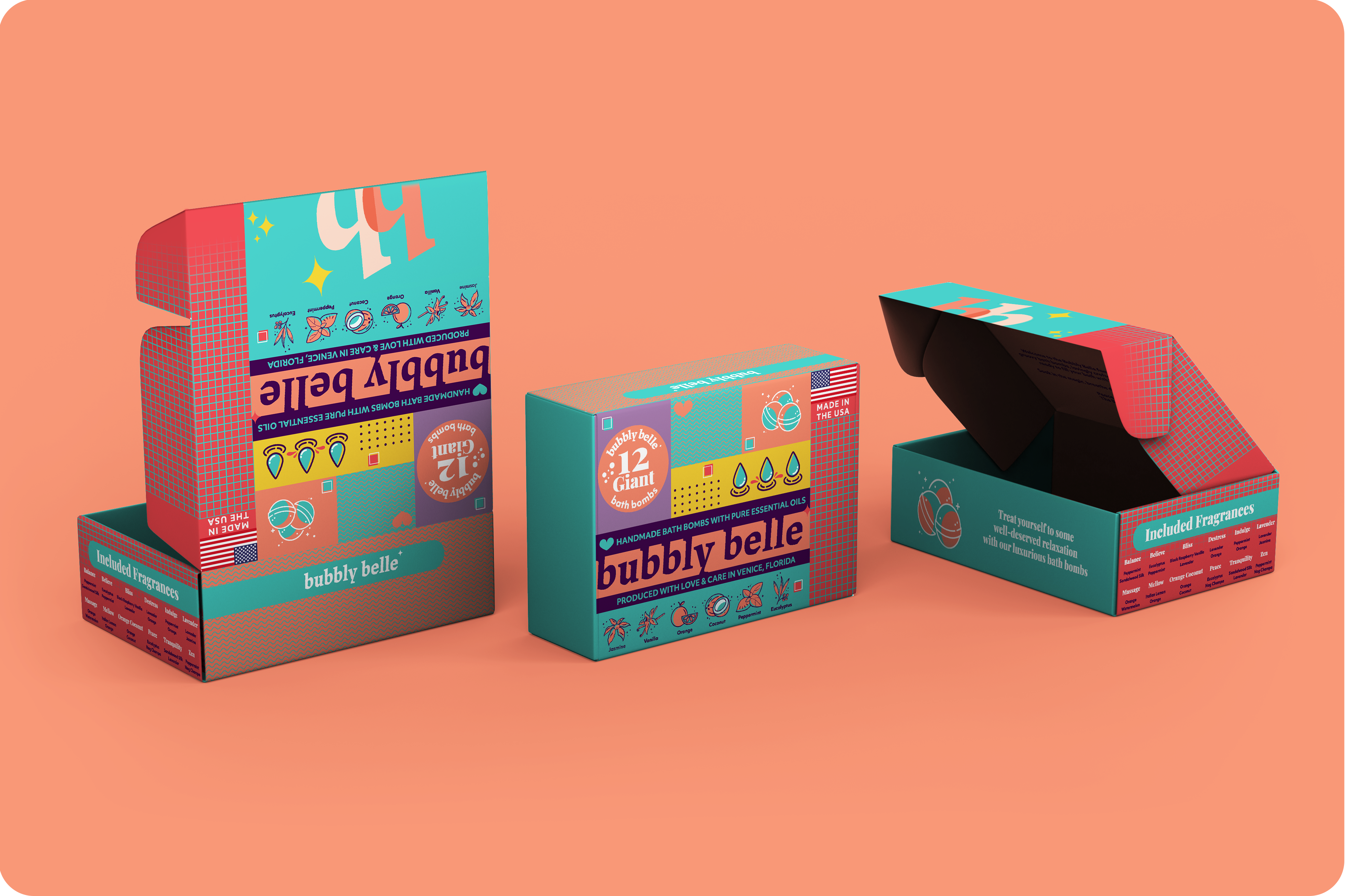 I opted not to alter the logo itself, recognizing its strong association with Bubbly Belle’s existing community of loyal customers. By preserving this visual anchor, we maintained continuity in the market while embarking on a refreshing brand transformation. In aligning with Bubbly Belle’s vision for a modern, colorful, and playful brand, I carefully curated a palette that exudes both vibrancy and tranquility. I introduced a harmonious blend of tones, including “Soothing Seafoam” turquoise, “Lavender Mist” light purple, “Peachy Paradise” peach, “Crimson Bliss” carmine red, and “Sunshine Spark” yellow. Each color resonates with the brand’s aspiration for a modern, colorful, and playful identity, enhancing the joy and relaxation associated with their products. Employing an “Organized Chaos” approach in layout design, I struck a balance between order and spontaneity. This layout not only provides a structured framework for communication but also mirrors the fluidity of relaxation, inviting customers to find solace in the gentle chaos, offering a therapeutic escape from daily stresses. In summary, these strategic choices were made to preserve brand recognition, evoke playfulness, and offer a calming yet joyful experience for customers, aligning closely with Bubbly Belle’s mission of bringing more calm into the world through indulgent self-care experiences.